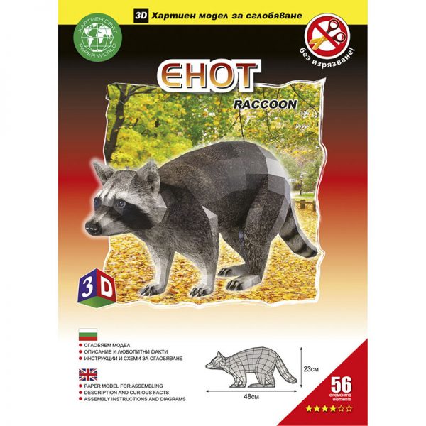 Хартиеният 3D модел за сглобяване “Енот” има както занимателна, така и образователна цел. Сглобяването му помага по един занимателен начин да се развиват сръчността, последователността, логическото и пространственото мислене у децата.
