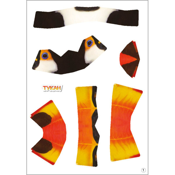 В приложенията към комплекта ще намерите също и подробна, богато илюстрована информация и любопитни факти за видовете, живота, местообитаването, разпространението и навиците на птиците от вида Тукан. Благодарение на внушителните размери на клюна си, оцветен в ярки цветове – от наситено червено до ярко жълто, Туканът е един от